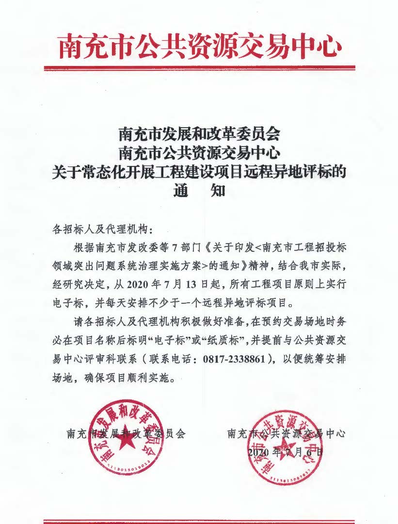 南充市發(fā)展和改革委員會、南充市公共資源交易中心關(guān)于常態(tài)化開展工程建設(shè)項目遠程異地評標(biāo)的通知
