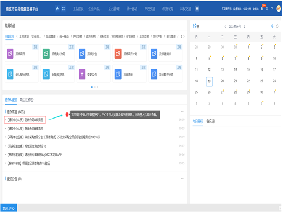 中標單位簽署完成提交流程后中心人員即可在代辦事宜中收到代辦消息。