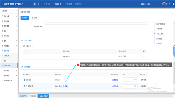 點擊新增在線合同后會進入到合同公告編輯頁面,首先將上方的合同內(nèi)容填寫完畢,然后在附件信息中上傳合同電子件,上傳后先將電子件轉(zhuǎn)換成pdf然后再pdf格式的合同上完成簽章。簽章結(jié)束后點擊左上角提交備案將流程提交至中標人。