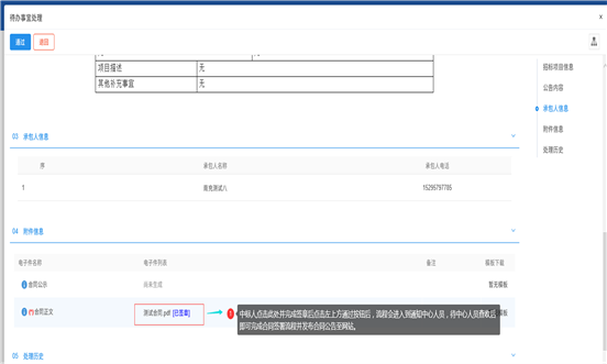 中標人進入合同頁面后點擊合同正文中的附件并完成簽章,簽章完成后點擊通過按鈕即可將流程提交給中心人員。