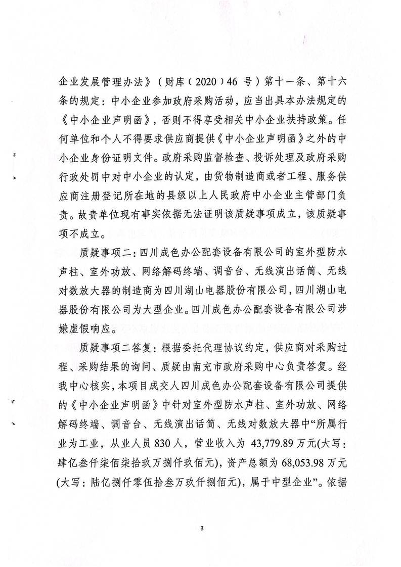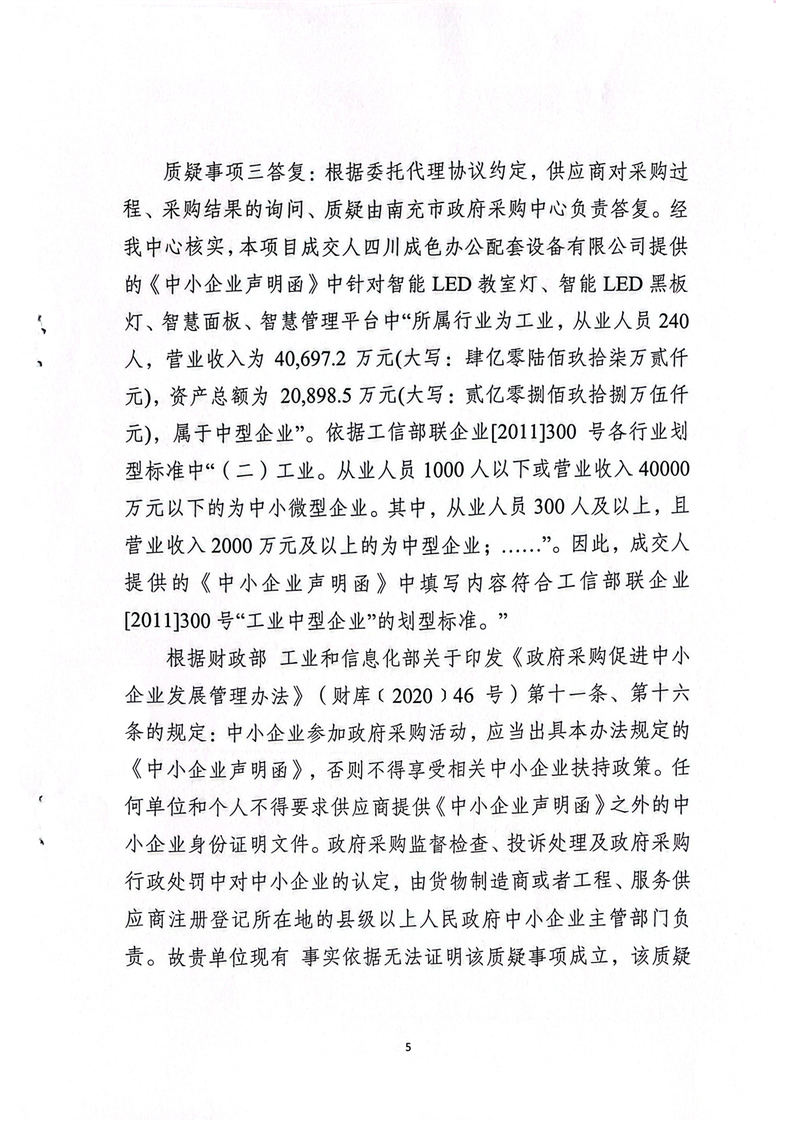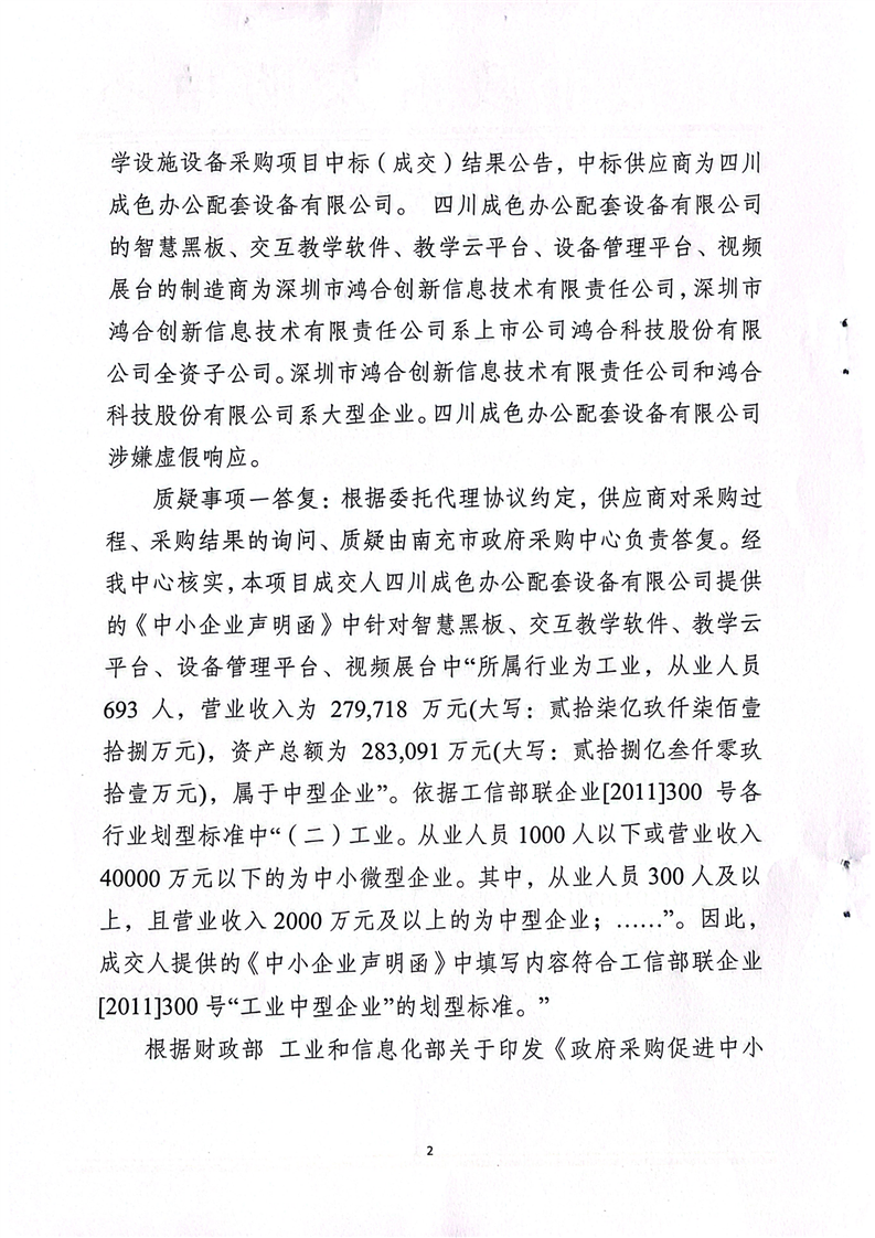南充市政府采購中心關于南充職業(yè)技術學院附屬中學校新校區(qū)教學設施設備采購項目的質疑答復