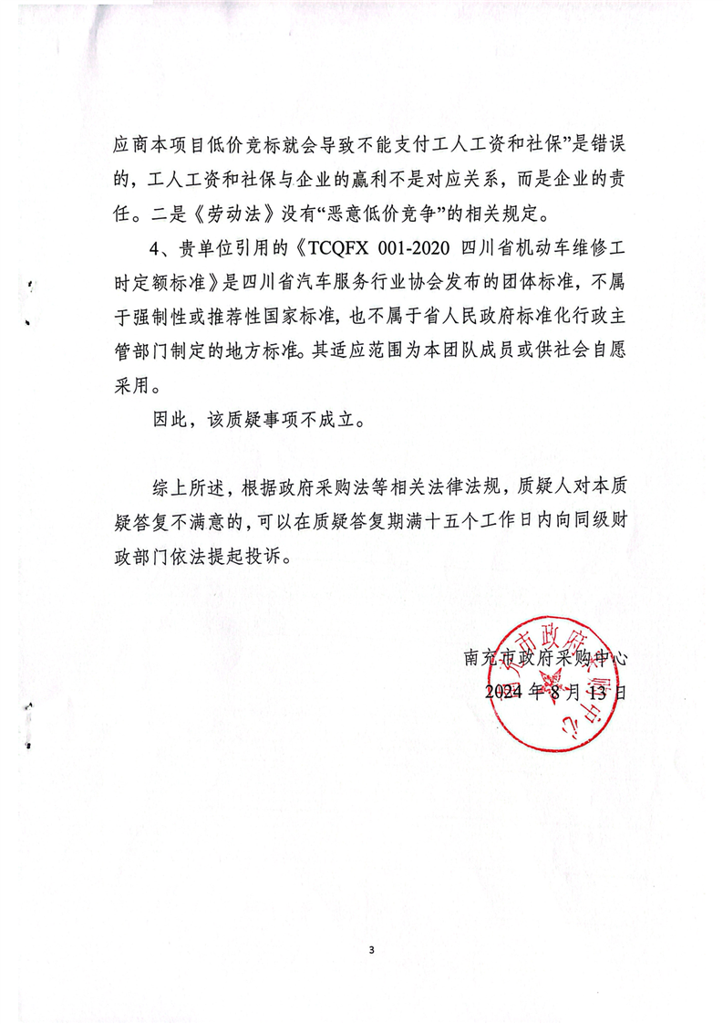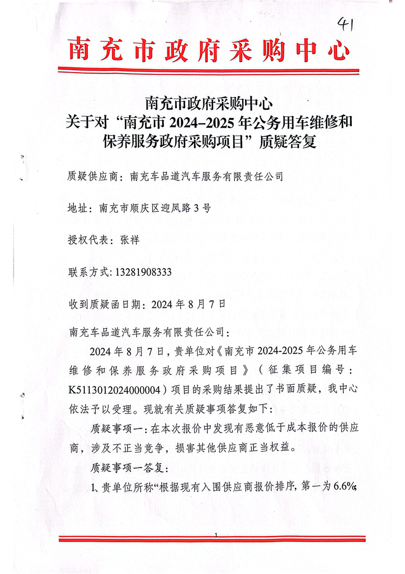 南充市政府采購中心關(guān)于對“南充市2024-2025年公務(wù)用車維修和保養(yǎng)服務(wù)政府采購項目”質(zhì)疑答復(fù)(南充車品道汽車服務(wù)有限責(zé)任公司)
